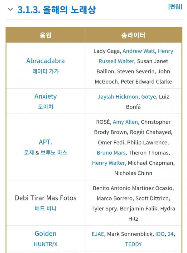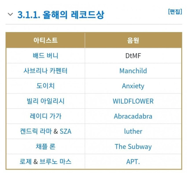 그래미 올해의 노래, 올해의 레코드 부분 노미
