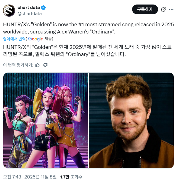 케데헌 '골든' 2025년 발매곡 중 스트리밍수 1위