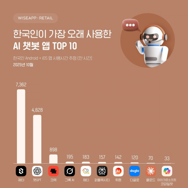 실시간 앱·결제 데이터 기반 시장 분석 설루션 와이즈앱 리테일이 국내 안드로이드 사용자 3천661만명과 iOS 사용자 1천461만명을 통계적 추정한 결과 지난달 제타 사용 시간은 7천362만시간으로 전체 AI 챗봇 중 1위를 기록했다.