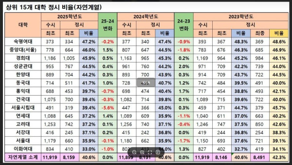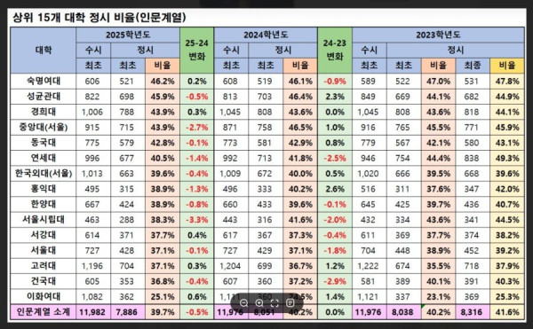 인서울 중상위권 대학 정시비율