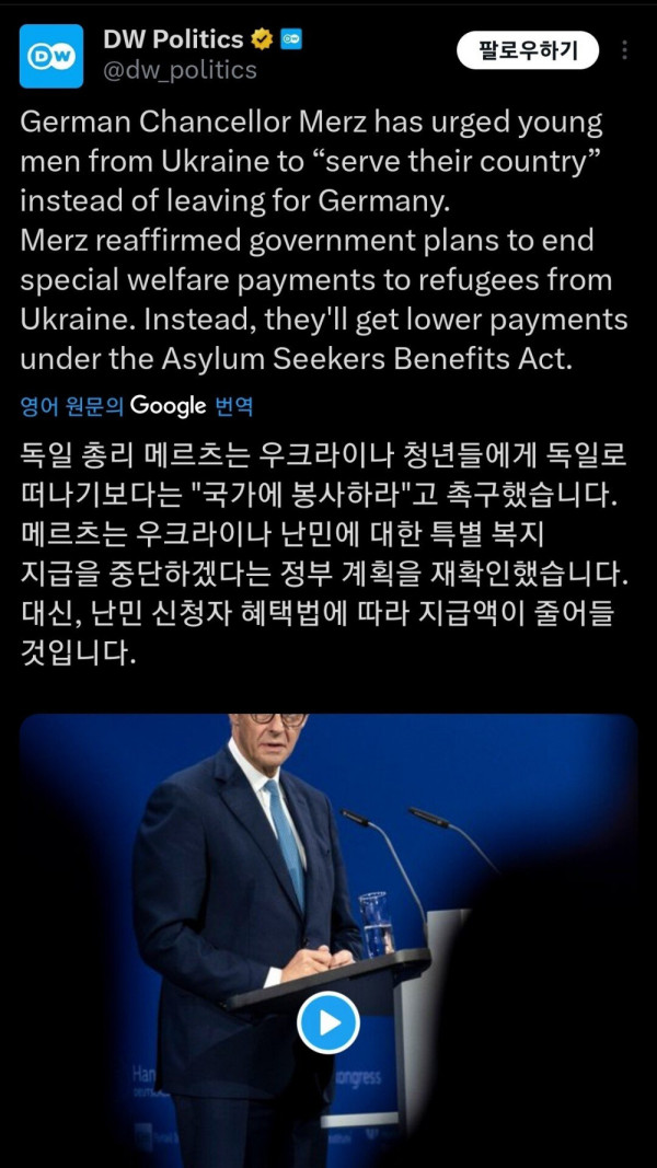 [ 독일 총리 메르츠 : 우크라이나 난민들 돌아가라 ]