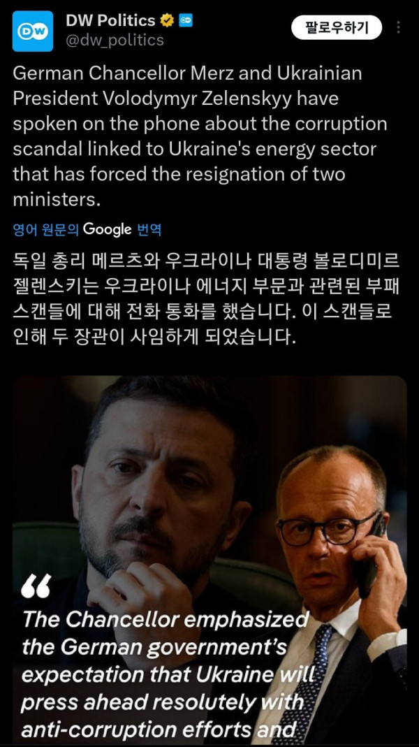 메르츠가 전화해서 이따구로 하면 너네 지원 여론 악화된다 경고