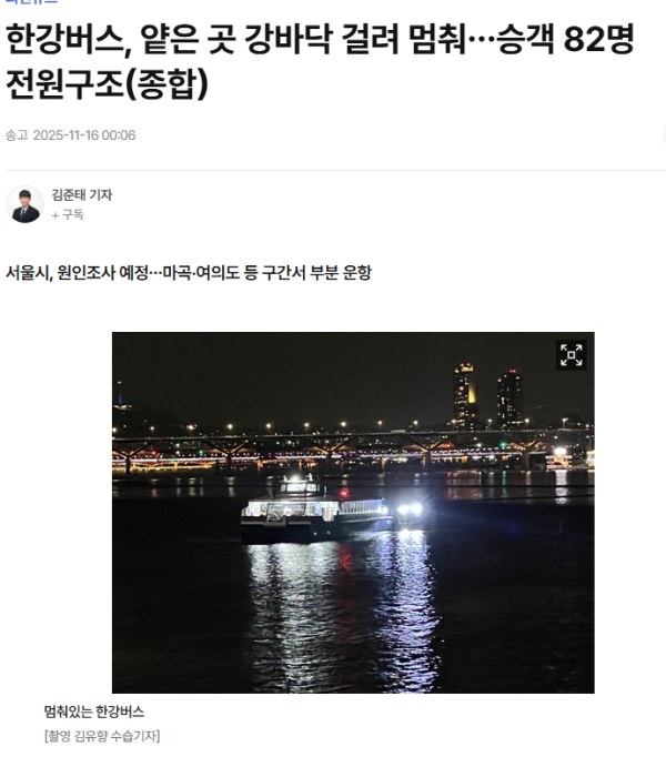 한강버스, 얕은 곳 강바닥 걸려 멈춰…승객 82명 전원구조(종합) | 연합뉴스