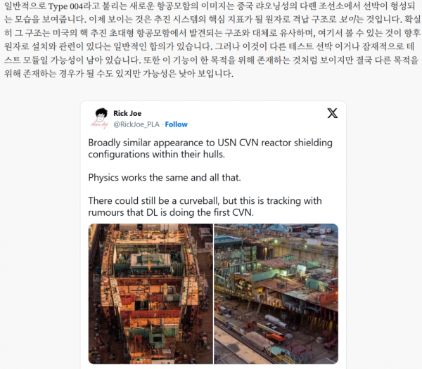 미해군 핵추진 항모의 원자로 차폐 구조와 유사해 보인다고 함
