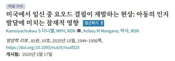 올해 나온 논문에 미국에서 요오드 결핍이 재발, 증가하고 있다고 보고 됨. 미국은 요오드 소금을 통해서 요오드결핍이 안정권으로 왔다고 하는데 요오드 결핍이 증가하니 영양 정책이 필요하다고 함. 그만큼 미국을 비롯해서 해외는 요오드 섭취를 매우 중요하게 보는데 당장 한국은 요오드 과섭취하는 국가 중 하나임. 왜냐하면