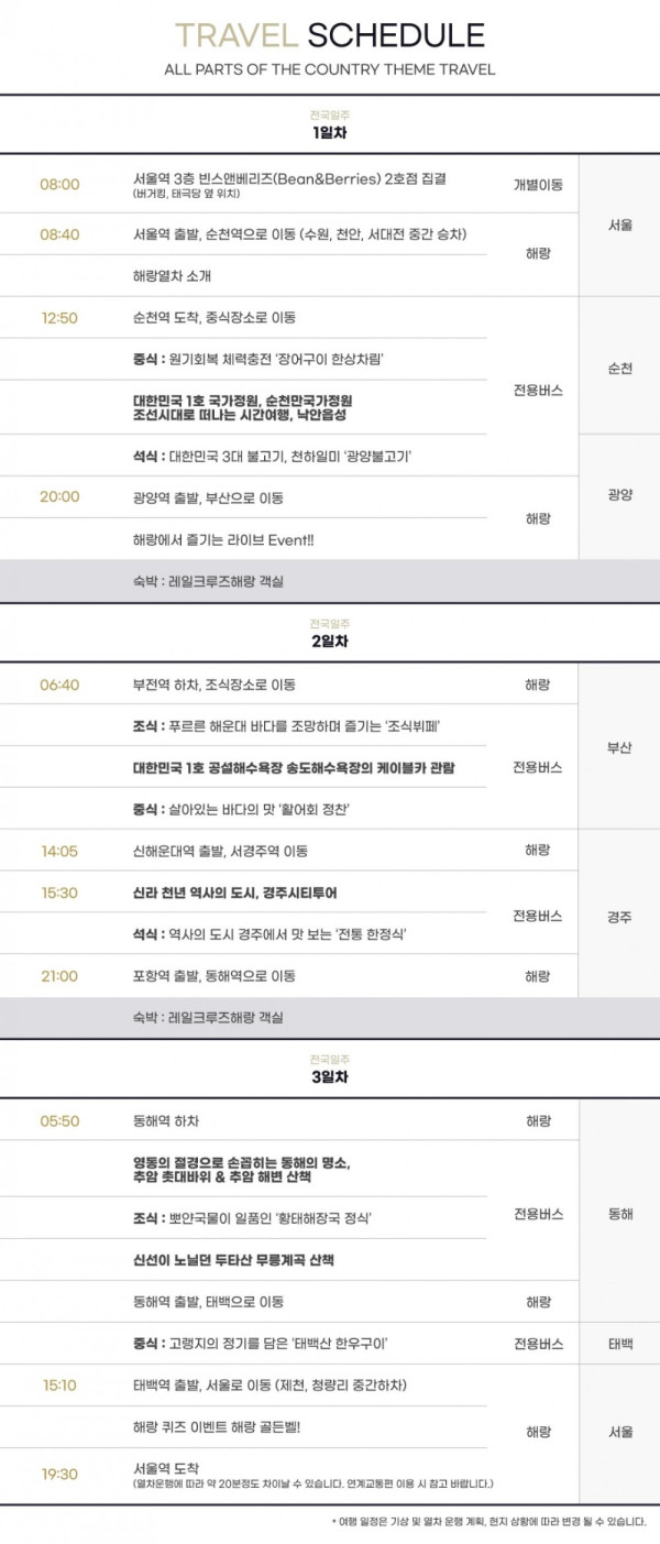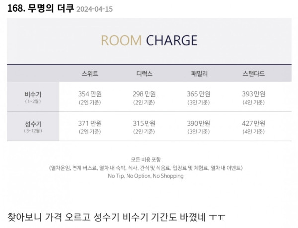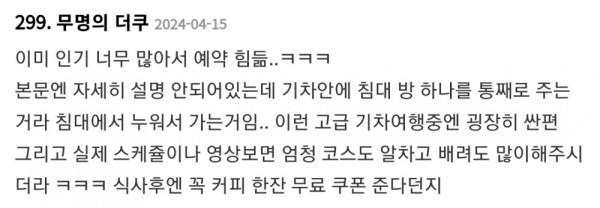 위에 저 요금표를 내면 기차요금 + 숙박비 + 각 끼니별 식비 + 그 외 모든 부대서비스를 이용하면서 단 1원도 더 안 내도 됨
