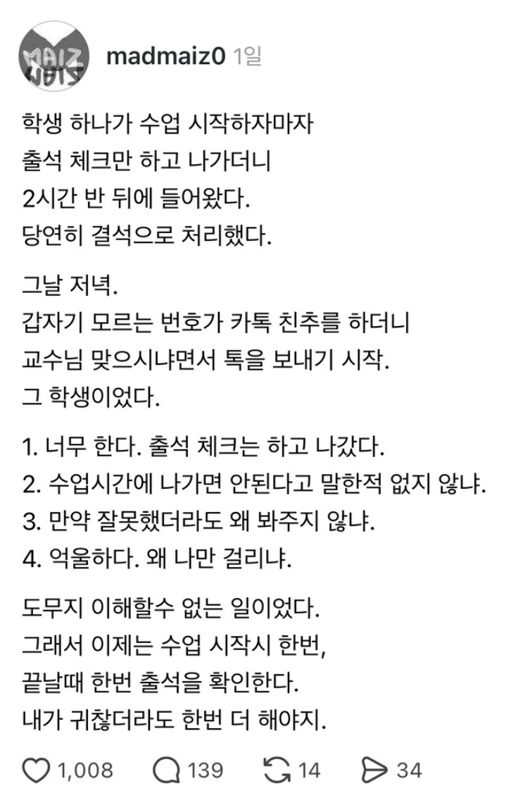 출석 체크만 하고 강의실 나간 대학생의 최후