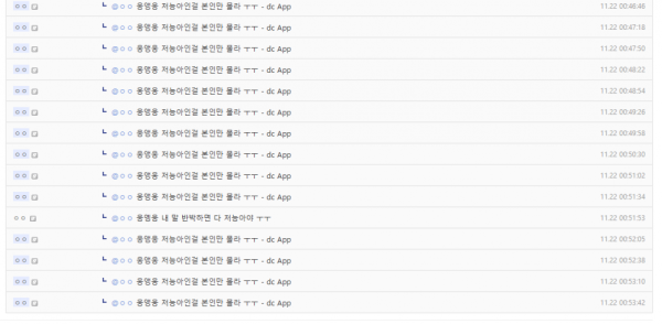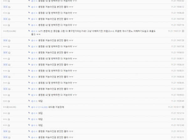 다른 사람이 "웅앵웅 내 말 반박하면 다 저능아야 ㅜㅜ"로 다시 글쓴이에 댓글에 응수를 했고