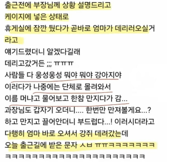 피치못할 사정으로 회사에 강아지 데려간 직원