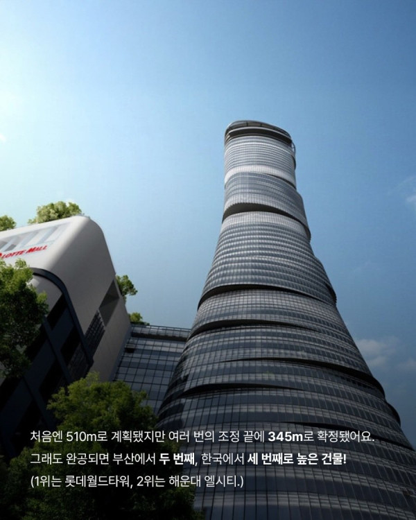 서울 롯데월드타워와 부산 엘시티에 이어 한국에서 3번째로 높은 건물(345m)이 될 예정이에요.