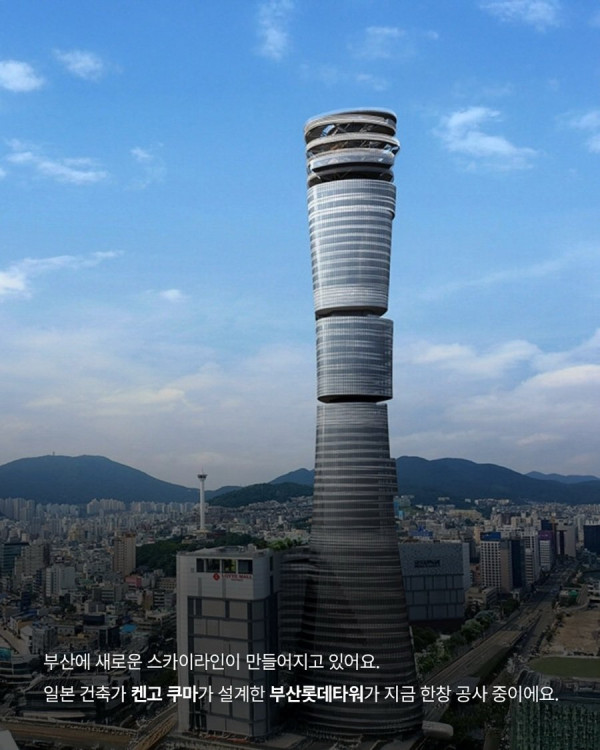 일본 건축가 켄고 쿠마가 설계한 부산롯데타워가 남포역 옛 부산시청 자리에 올라오고 있어요.