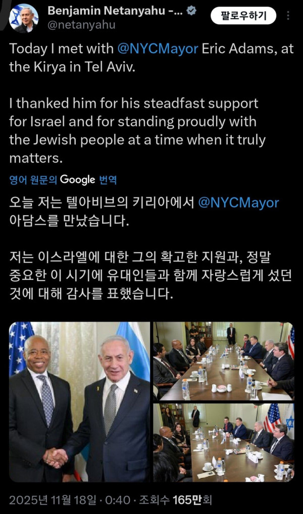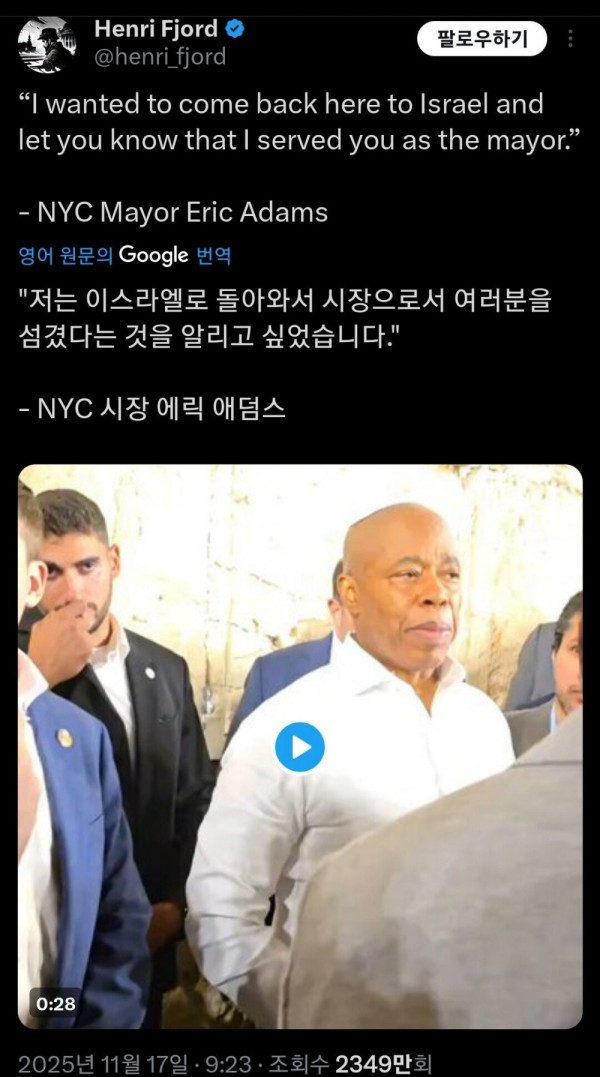 뉴욕시장 선거 끝나고 이스라엘 달려간 현 뉴욕시장 에릭 아담스