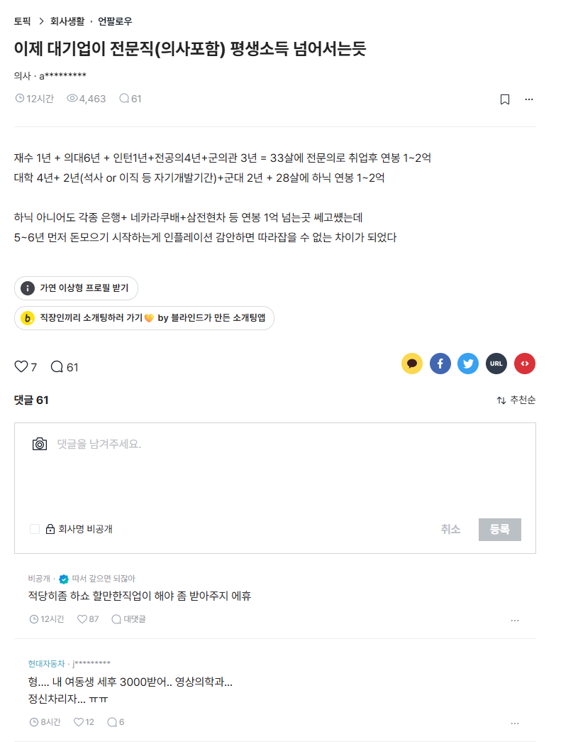 이제 대기업이 전문직(의사포함) 평생소득 넘어서는 듯