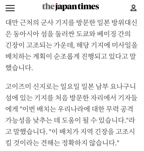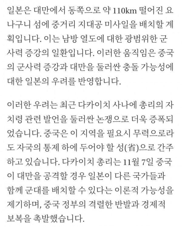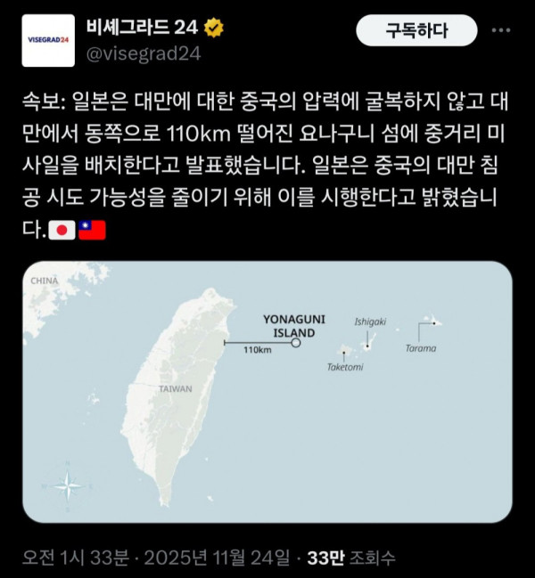 대만 110km 섬에 미사일 배치계획 발표한 일본