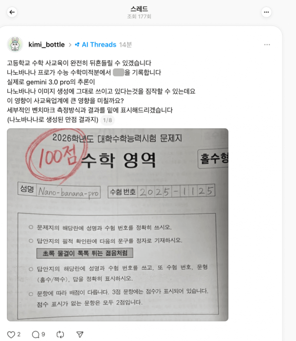 구글 나노바나나 프로, 수능 미적분 만점 받아