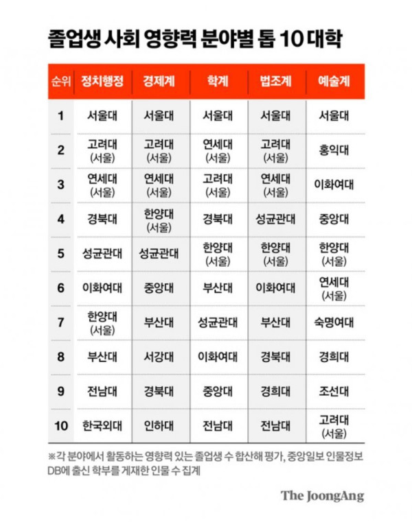 졸업생 사회 영향력 분야별 TOP 10 대학