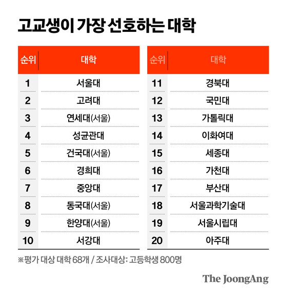 고교생이 가장 선호하는 대학 (중앙일보 조사)
