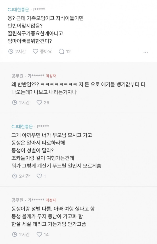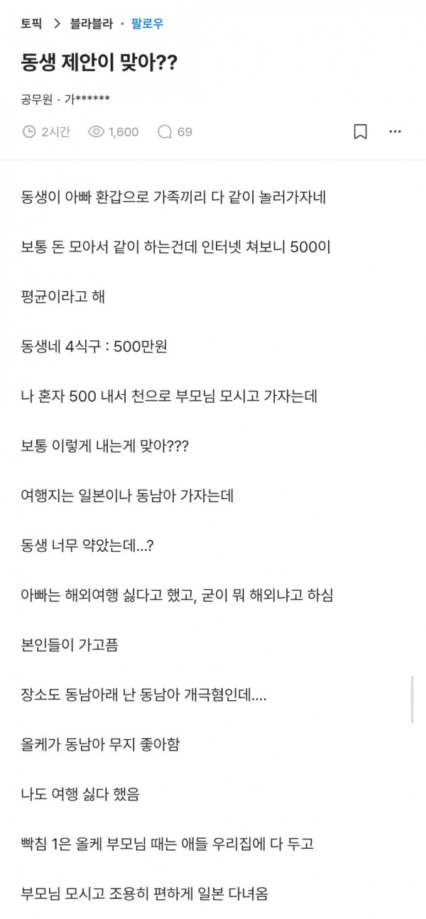 형제 중 결혼안한 사람들이 늘어나면서 비슷한 고민이 커뮤에 되게 자주 올라오는듯 (ex. 여행, 식사자리, 형제곗돈..)
