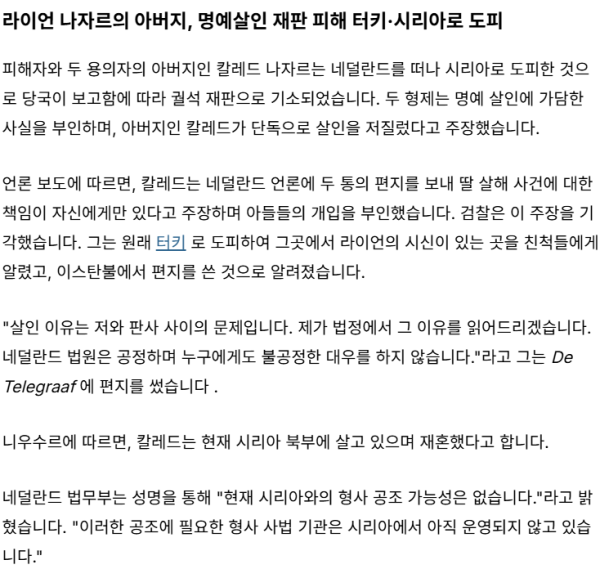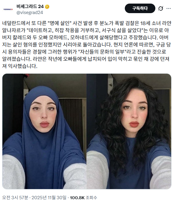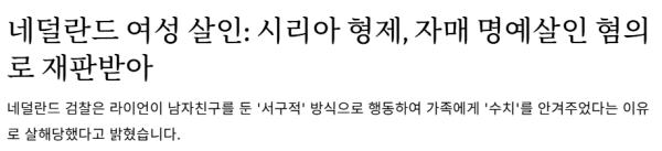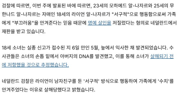 여기서 최악은 아버지라는 새끼는 딸 살해의 주동자이자 아들들에게 살해 지시해놓고 지는 아들까지 버리고 시리아로 도피해서 재혼했다고 함.