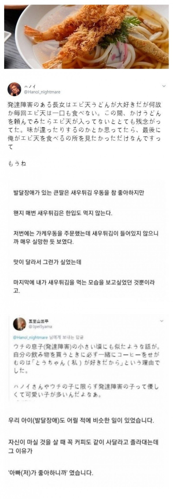 발달장애인 큰딸이 새우 튀김우동을 좋아합니다