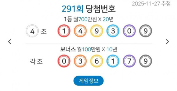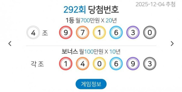 이번주(292회) 1등 당첨번호와 정확히 일치함 ㅋㅋ