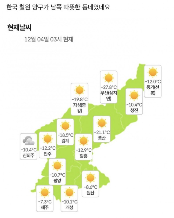 북한 날씨는 진짜 살벌하네