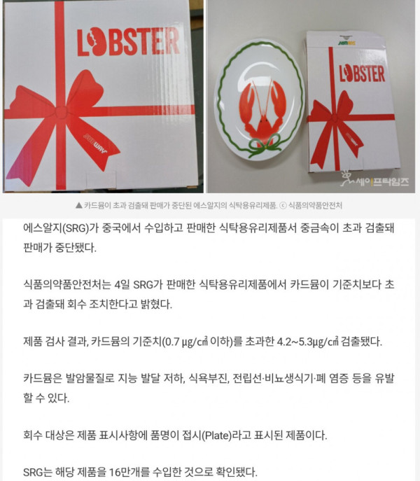 검사결과 카드뮴 기준치 초과로 회수명령 내림 수치는 기준치(0.7 ㎍/㎠ 이하)를 초과한 5.3 ㎍/㎠, 4.6 ㎍/㎠, 4.2 ㎍/㎠가 각각 검출됨 보상으로 구매 고객들에게 8천원 모바일 쿠폰 지급 예정