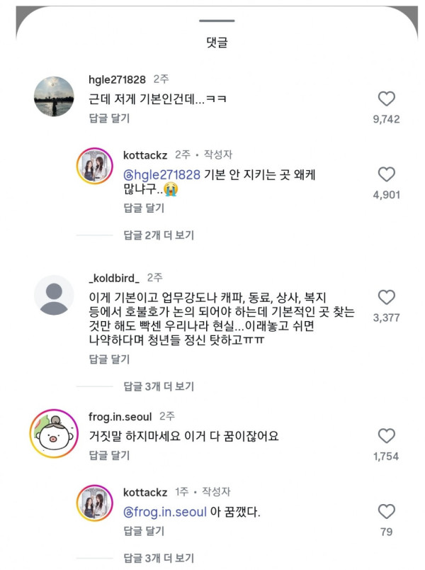1. 출근 첫 날 근로계약서 작성 2. 사수 & 인수인계 파일 있음 3. 청소 안해도 됨 4. 야근 수당 있음 5. 장기근속자 많음