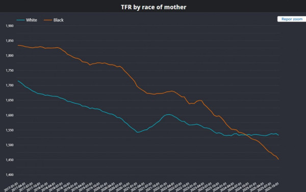 흑인 출산율은 끝도없이 하락하다 작년 말부터 백인과 데드 크로스를 찍고 1.45까지 추락중임