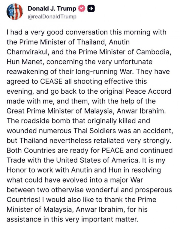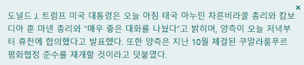 도람프 : 태국.캄보디아랑 통화했고 휴전하기로 합의 했음.