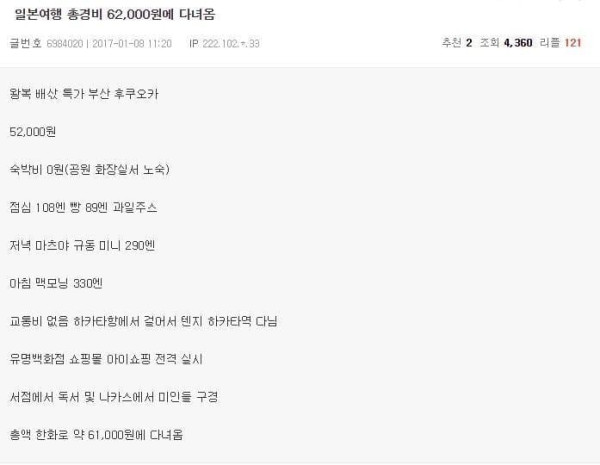 일본 여행 총경비 62,000원에 다녀옴