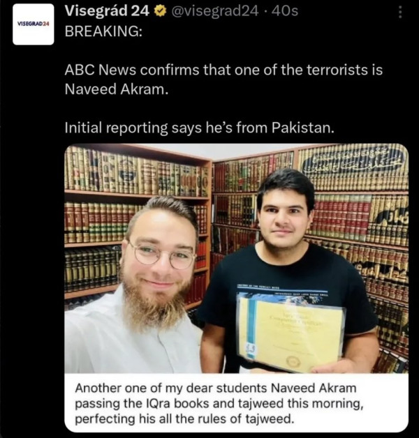 파키스탄 출신 24살 무슬림 Naveed Akram 이라고 함