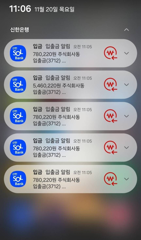 매월 20일 5,460,220 원 + 780,220×4 원 입금내역 뜸