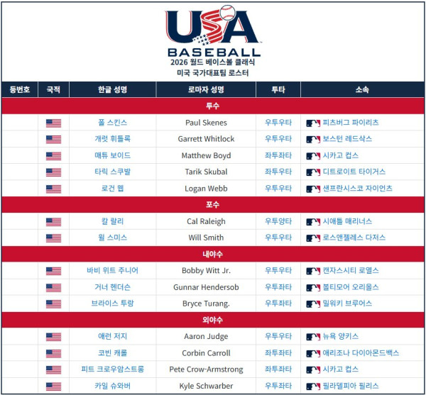 [오피셜] 지금까지 발표된 WBC 미국대표팀 라인업