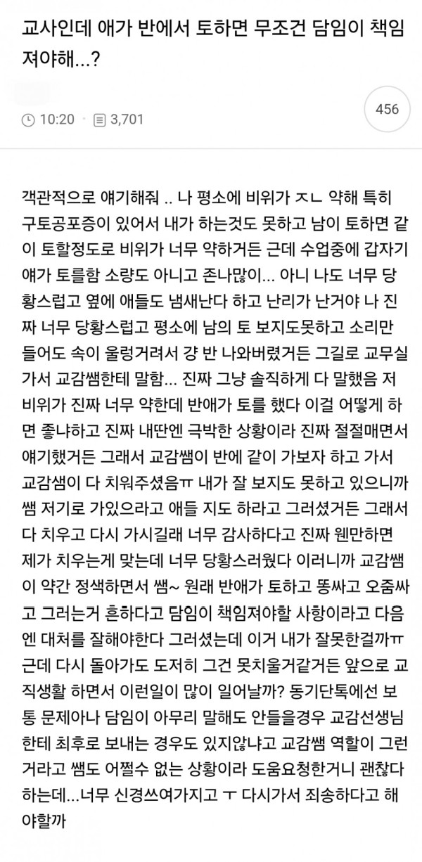 교사인데 애가 반에서 토하면 무조건 담임이 책임 져야해?