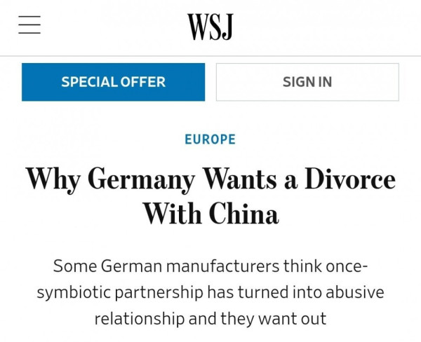 그러나 중국은 더이상 독일의 기술을 필요로하지 않으며, 베를린은 독일을 "착취하는 파트너"로 여기는 중국과의 이혼을 준비중임.