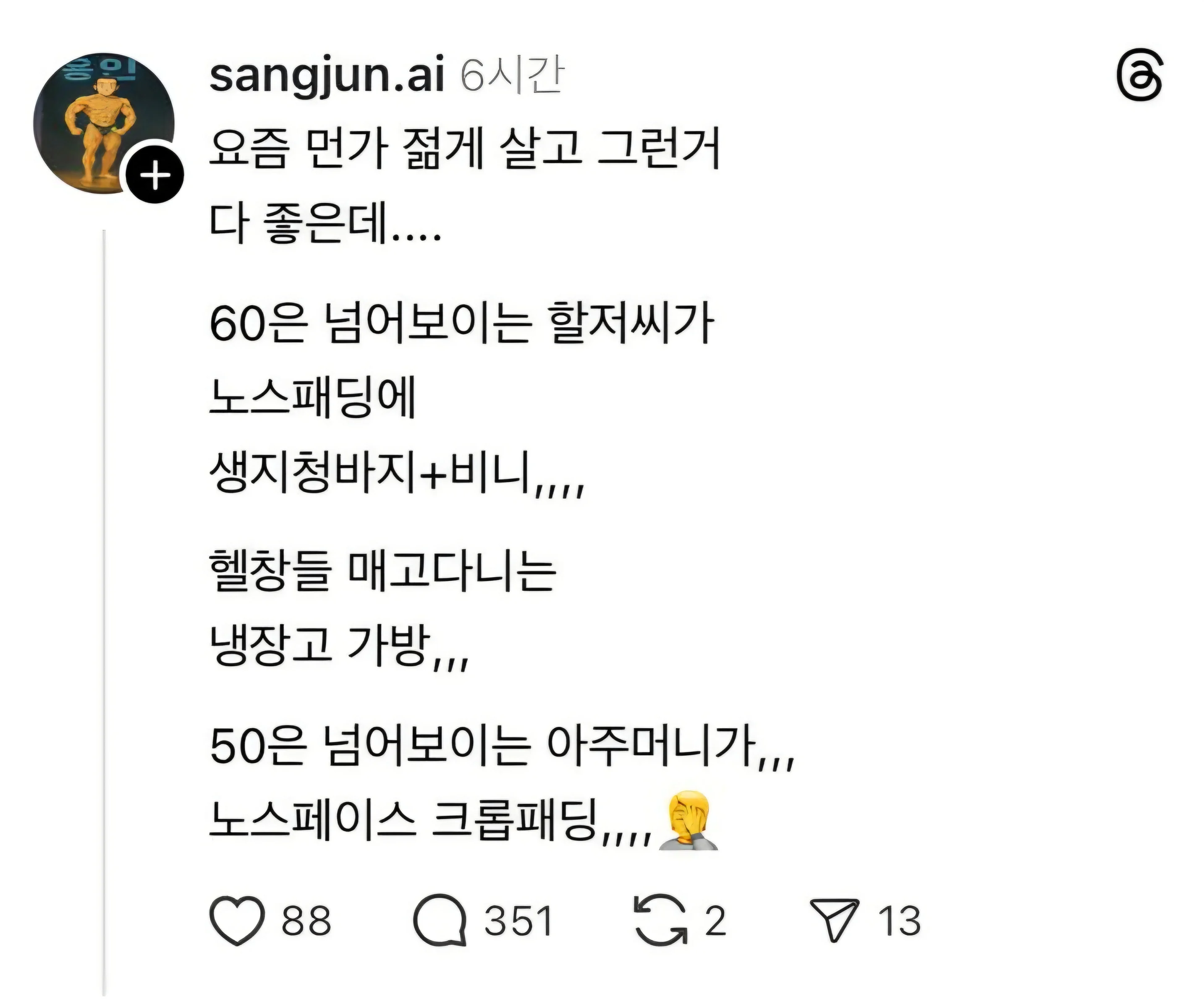 60넘은 할저씨가 노스패딩에 생지청바지가 뭐임 ㅋㅋㅋ