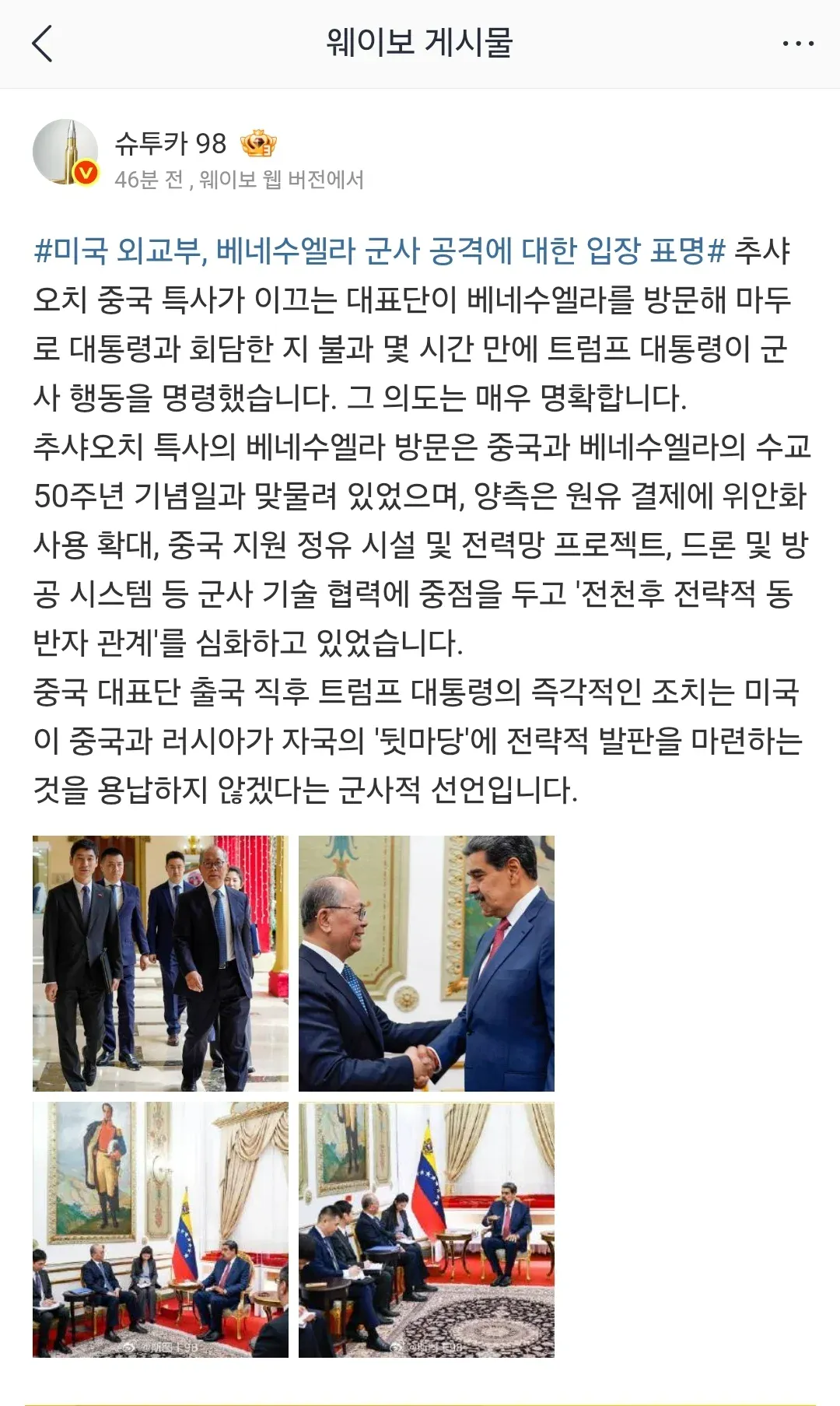 체포 몇 시간 전 추샤오치 중국특사와 만난 마두로
