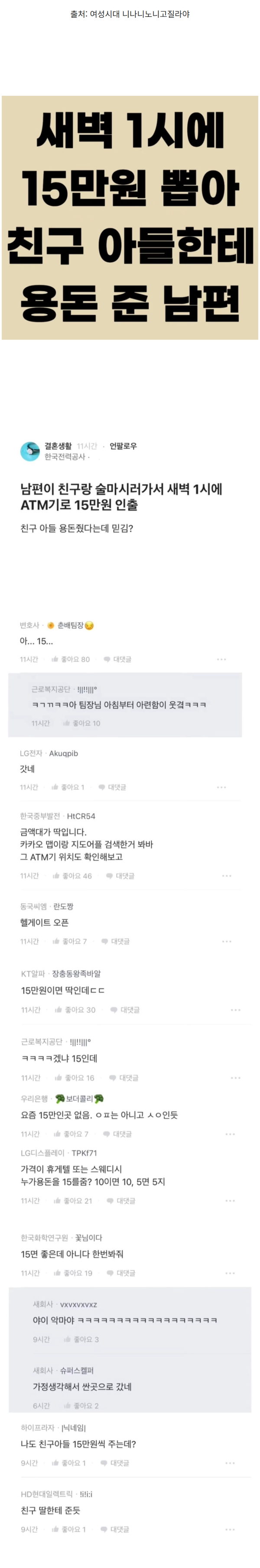 새벽 1시에 15만원 뽑아 친구 아들한테 용돈 준 남편