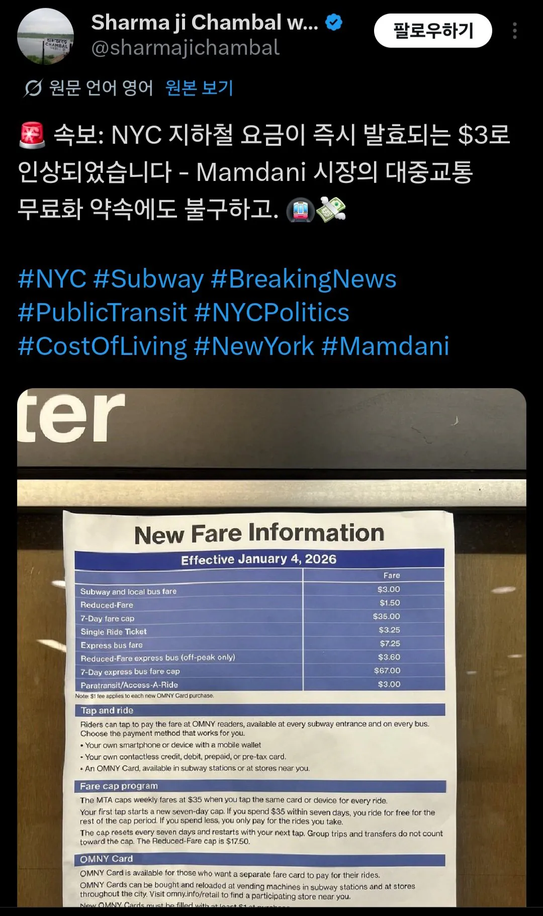 시장 취임 한지 얼마 안 가서 지하철 요금 3달러 인상됨 대중교통 무료화 약속 했던 뉴욕 시장 근황