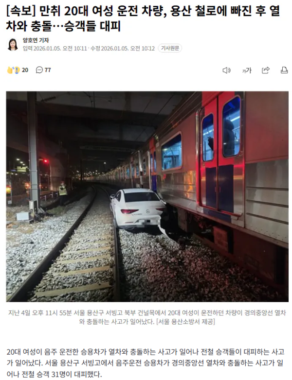 20대 여성 차량, 철로에 빠진 후 열차와 충돌
