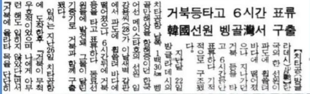남미의 니카라과 근해를 항해중이던 화물선 리베리아의 선원이던 김정남(27세)씨 역시 갑판에 실족해 바다에 빠져 익사할뻔 하다가 거대한 거북이의 잔등에 매달려 15시간이나 표류하다가 구조되는 사건이 일어났다.