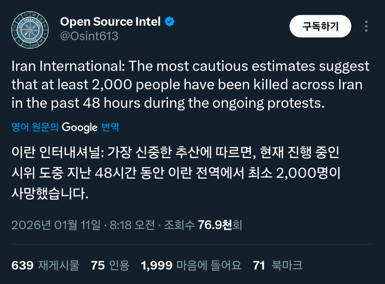 이란 전역에서 시위로 인해 최소 2,000명 이상 사망