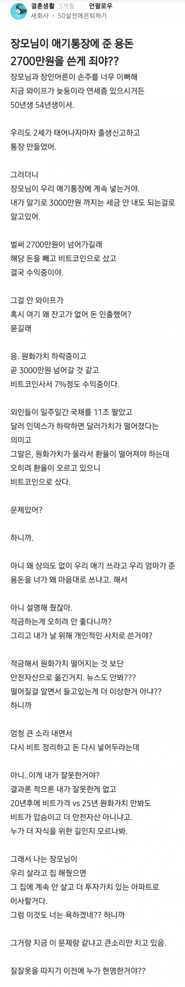 장모님이 애기통장에 준 용돈 2700만원을 쓴게 죄야??
