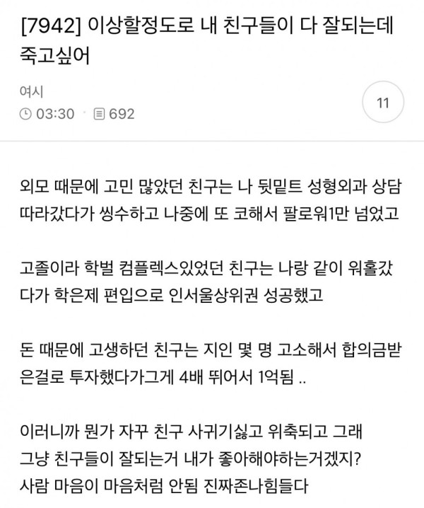 이상할 정도로 내 친구들이 다 잘되는데 죽고싶어