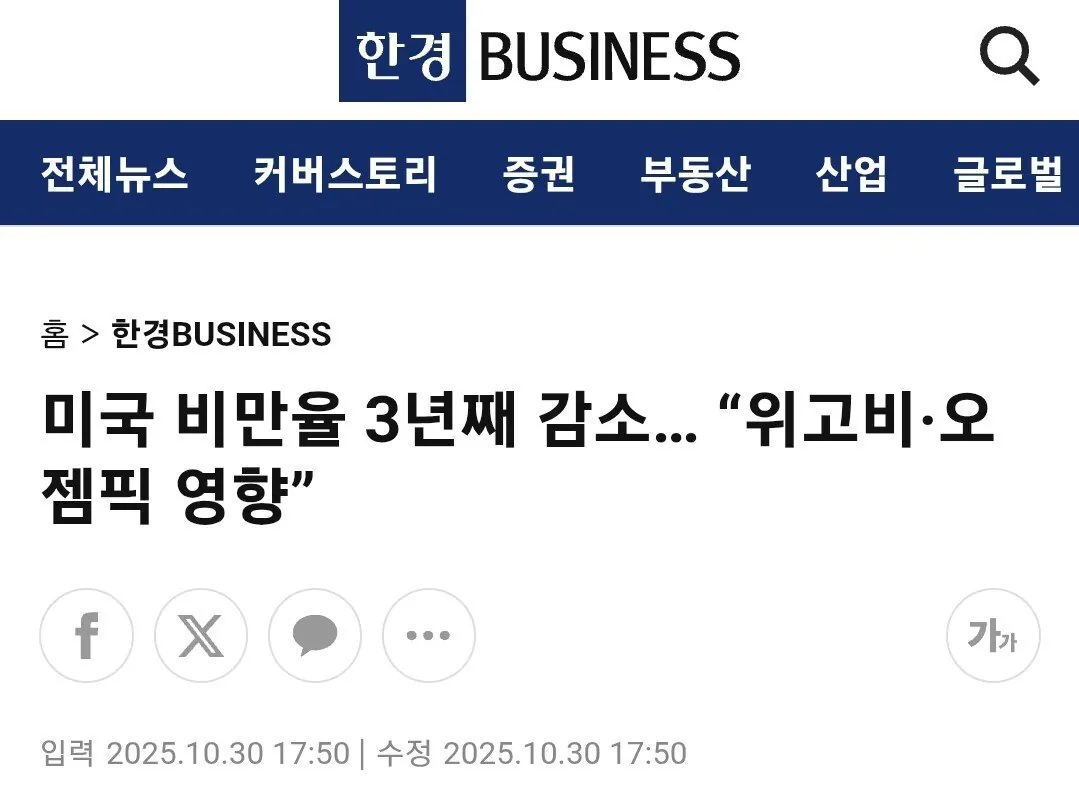 미국에서 비만 치료제 대박나고 실제로 비만율이 줄어들고 있는데 이로 인해 미국 항공업계가 반사이익 얻고 있음
