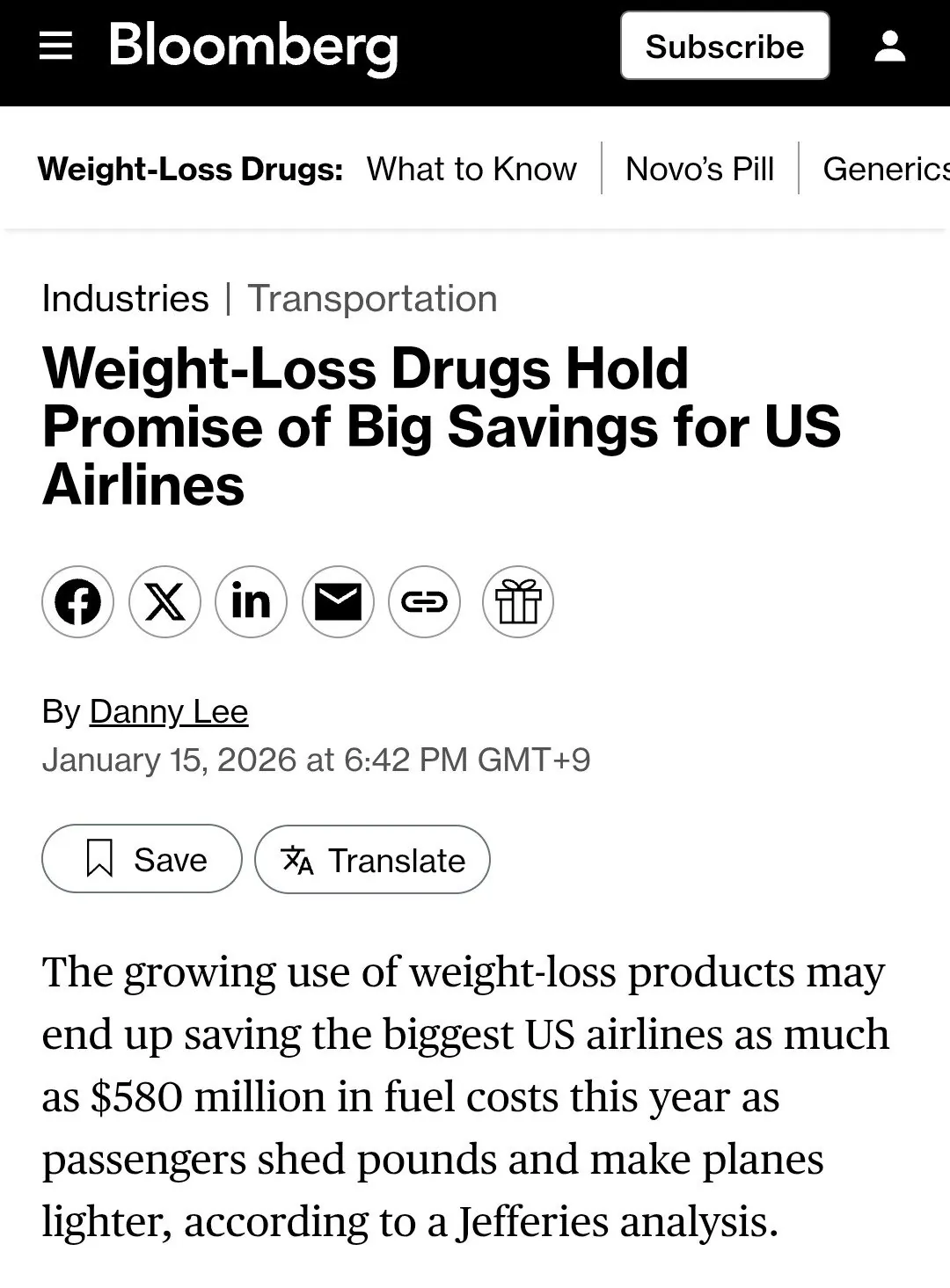 승객의 체중이 10% 감소하면 연료비가 최대 1.5% 절감되고 주당 순이익이 4% 증가한다고 하는데 분석가들은 미국 성인 비만율이 3년 연속 감소하고 체중 감량 약물을 복용하는 성인 수가 두 배로 증가한 점을 근거로 삼았음