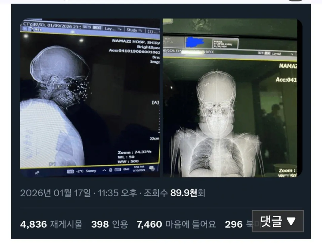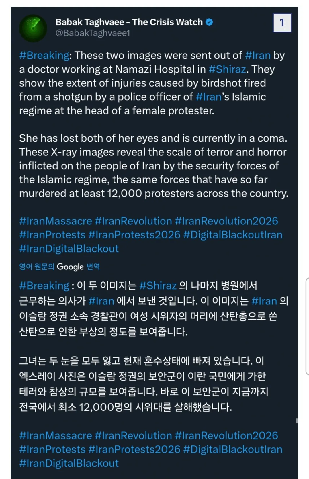 산탄총을 맞은 이란 시위대 여성의 엑스레이 사진 공개