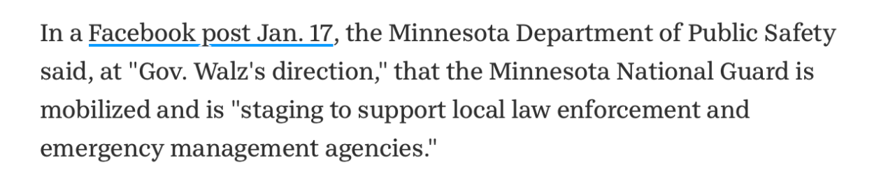 거기에 맞서서 미네소타 주지사 팀 월즈(카말라 해리스의 런닝메이트로 부통령 후보로 나왔던 사람임)가 주방위군 투입시키고 미네아폴리스 주변에 배치시킴.