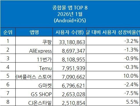 쿠팡이 압도적인 1위고 의외로 네이버쇼핑은
